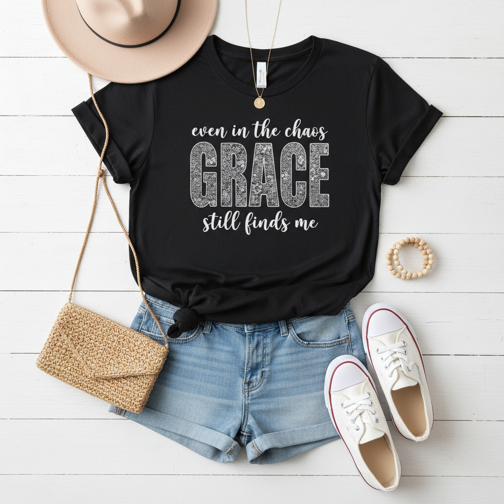 This bold, typography-forward design makes a powerful statement with contrast — soft script paired with strong block lettering to highlight what matters most: GRACE. It’s the reminder you wear when life feels overwhelming but your faith keeps you steady.